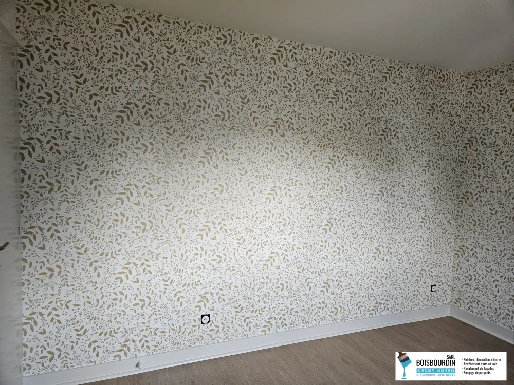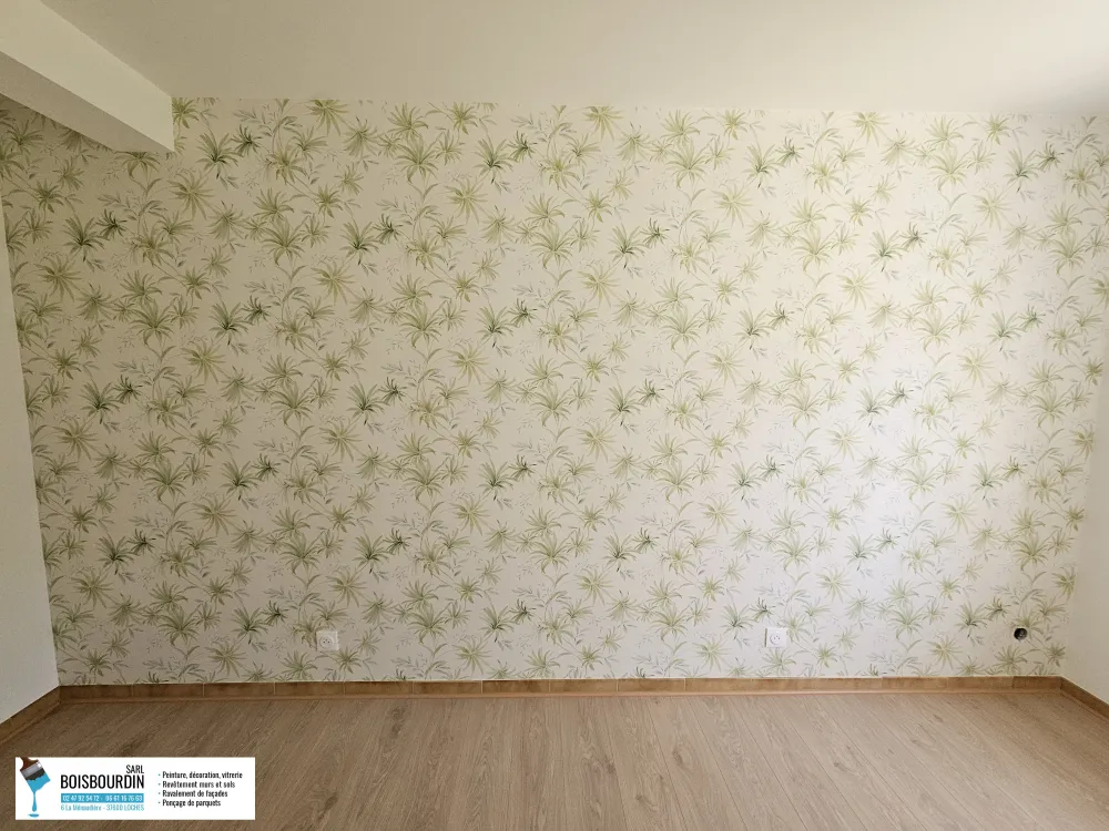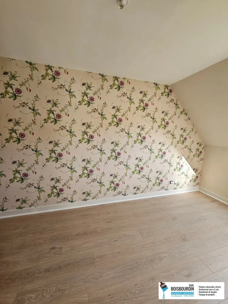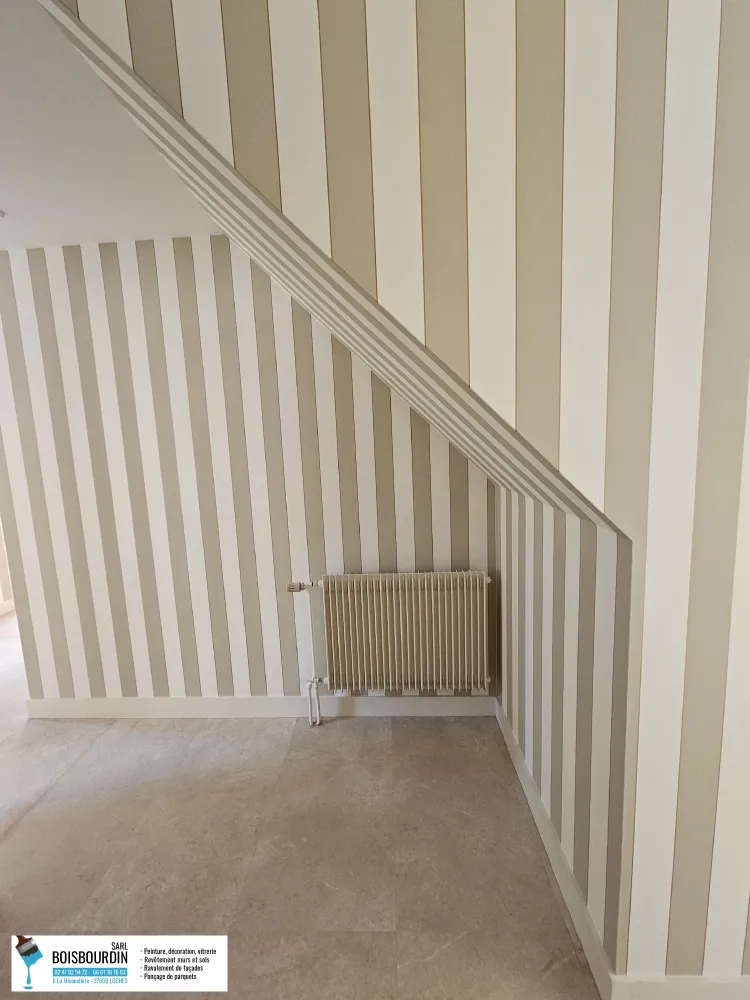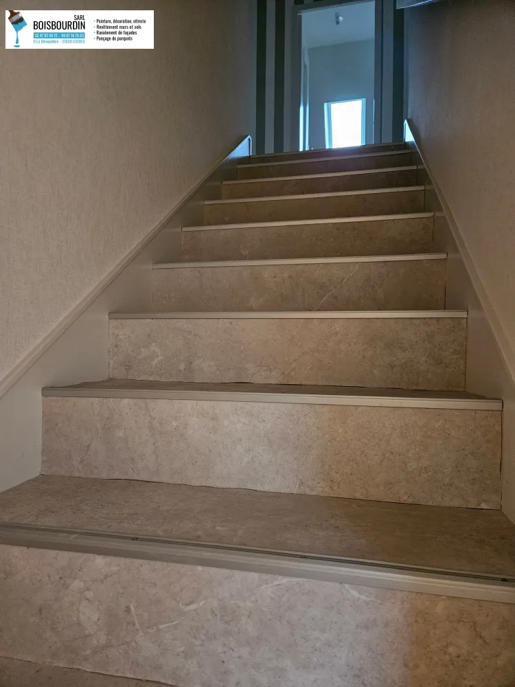 Votre artisan peintre de Loches a réalisé les travaux de peinture intérieure, la pose de papier peint, la pose de parquets flottants, ainsi que l'habillage d'un escalier en sol PVC.